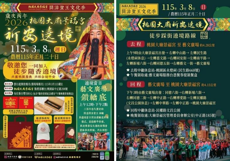 由桃園大廟景福宮主辦「2026開漳聖王文化季暨遶境踩街活動」,將於115年3月8日(星期日)上午7時至晚間8時,在桃園區市中心周邊盛大舉行。當日中午12時於桃園藝文廣場、下午4時於景福宮廟埕安排精彩定點演出,誠摯邀請市民朋友一同參與,共襄盛舉、祈福迎祥。