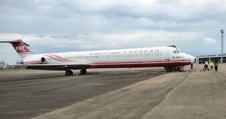 圖/高雄分署3月17日拍賣的遠航MD-82航空器,目前停放於高雄國際航空站