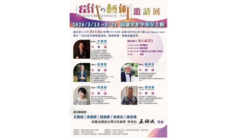 「2026當代藝術邀請展—王錦成、吳連賞、段逸君、孫吳也、張吉雄五人聯展」於2026年3月13日至3月24日,在高雄文化中心至上館盛大展出,並訂於3月14日(星期六)下午2時舉行開幕典禮,邀請藝術界先進與社會大眾共襄盛舉。