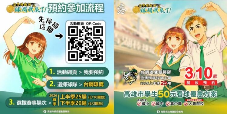 Team Taiwan在近期的2026 WBC世界棒球經典賽賽事中熱血奮戰、再創歷史,台灣英雄們的拚戰精神點燃全台棒球熱潮。為了讓更多年輕世代感受棒球魅力、培養進場觀賽的習慣,高雄市政府持續推動深受學生歡迎的「學生50元看球優惠方案」,2026年中華職棒賽季即將開打,台鋼雄鷹主場賽事也將在高雄熱鬧登場,上半季預約於3月10日上午10時正式開放,邀請學生朋友一起走進球場,用最熱血的方式支持台灣棒球。