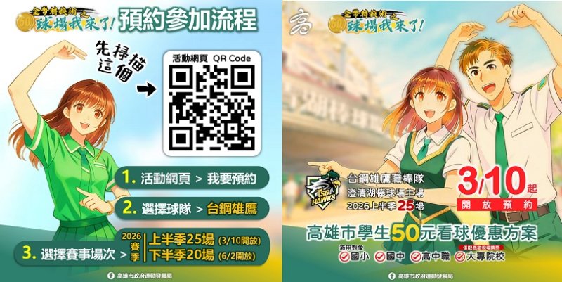 高雄市政府運動發展局長侯尊堯表示,只要是高雄市國小、國中、高中職及大專院校學生,憑一卡通數位學生證線上預約或現場購票成功,即可用銅板價50元進場觀賞台鋼雄鷹於澄清湖棒球場舉行的主場職棒賽事,2026年中職賽季全年共提供45場次、近萬個優惠名額,其中上半季25場於3月10日上午10時開放預約,下半季20場次則預計於6月2日上午10時開放。