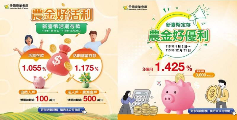 而「農金好優利」定存專案則自115年1月2日至12月31日限時申辦,針對單筆3,000萬元以上的新資金,提供3個月期1.425%年利率的優惠(單利計息、到期不續存)。申辦當日活存餘額需不低於最近六個月活存平均餘額,並限臨櫃辦理。