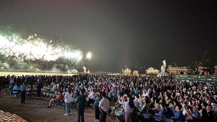 「2025澎湖國際海上花火節」28日晚間在觀音亭園區盛大試放,璀璨煙火點亮澎湖夜空,正式為澎湖觀光季揭開序幕。